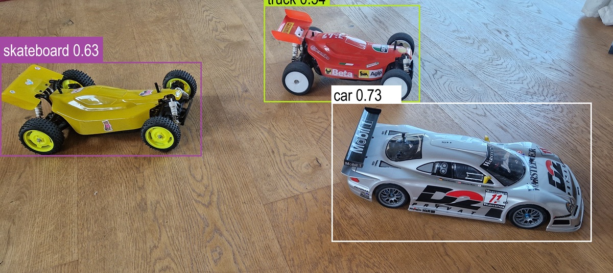 As you can see in the picture, the RC cars are not all recognized as cars, but some are recognized as skateboards or trucks. However, this is not a problem because we will take this into account in our software.