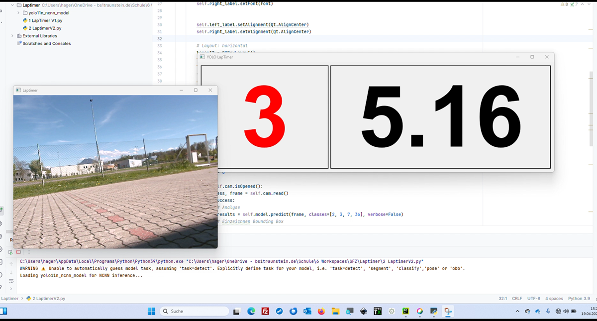 In general, it is not easy to recognize objects in images or videos. Fortunately, today we have powerful AI tools that make this very easy for us. For the lap timer, I use a pre-trained YOLO 11 AI model that can recognize 80 different objects, such as people, bicycles, and even cars. Using the camera is very easy with Python using the OpenCV library.