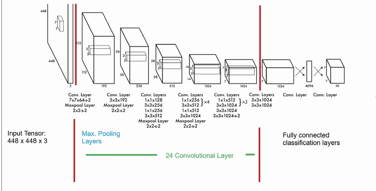 YOLO stands for You Only Look Once, a family of real-time object detection algorithms. It is widely used in computer vision tasks to identify and locate objects within images or video streams. YOLO is known for its speed and efficiency, making it suitable for applications requiring real-time processing, such as surveillance, autonomous vehicles, and robotics. As illustrated below, it has 24 convolutional layers, four max-pooling layers, and two fully connected layers.